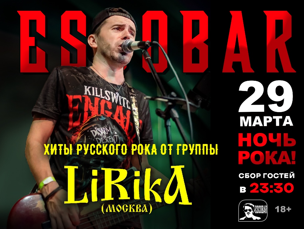 Эскобар представляет! В субботу 29 марта – LiRikA | Ночь русского рока! Лучшие хиты и всеми любимые песни в исполнении группы LiRikA! Сбор гостей в 23:30 ___ Бар Escobar: [...]